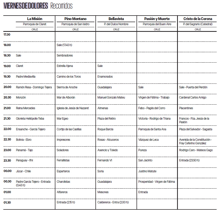 Parrilla de horarios e itinerarios del Viernes de Dolores 2019 Cadena SER La primera en salir desde la parroquia de San Isidro Labrador de Pino. Escrito por Twitter Juan Antonio BanderaRedactor de Pasin en Sevilla - ABC de Sevilla JABandera. Hermandad y Cofrada de Nazarenos de Ntro.